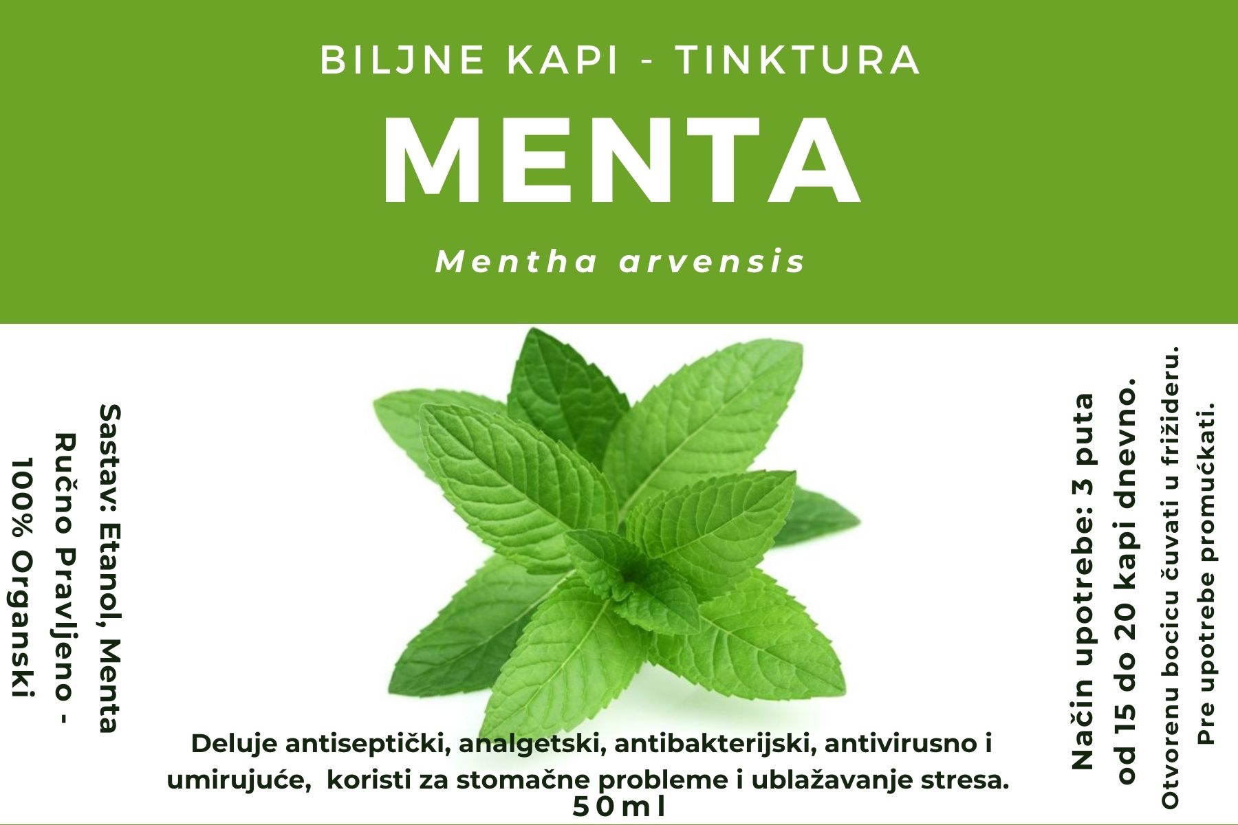 Primena: Aktivni sastojci lista nane deluju spazmolitično i analgetično, a gorke supstance povoljno deluju na lučenje sokova za varenje pa se upotreba preporučuje za olakšanje varenja i ublažavanje žučnih tegoba, kao i za eliminisanje gasova i ublažavanje bolova i grčeva. Tradicionalno, kapi nane se preporučuju i kao blago sredstvo za umirenje.